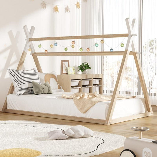 Oikiture Kids Canvas Teepee Bed Frame - Wooden Timber Platform for Imaginative Sleep