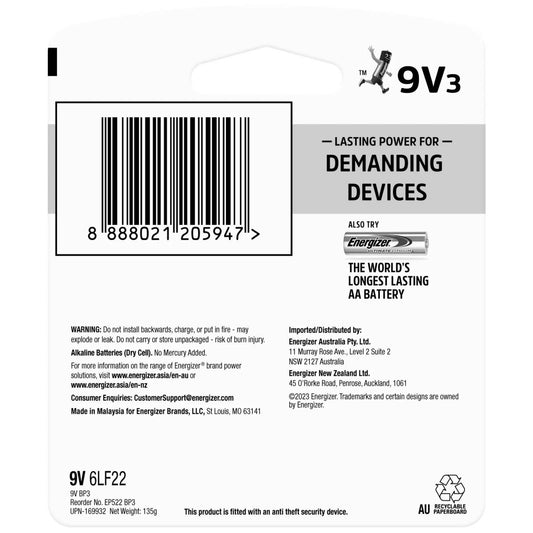 Energizer 9V Max Plus Batteries 3-Pack, Long-Lasting Alkaline for Smoke Alarms & Electronics