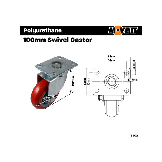 Move It 100mm Red Polyurethane Swivel Castor 150kg Load Capacity