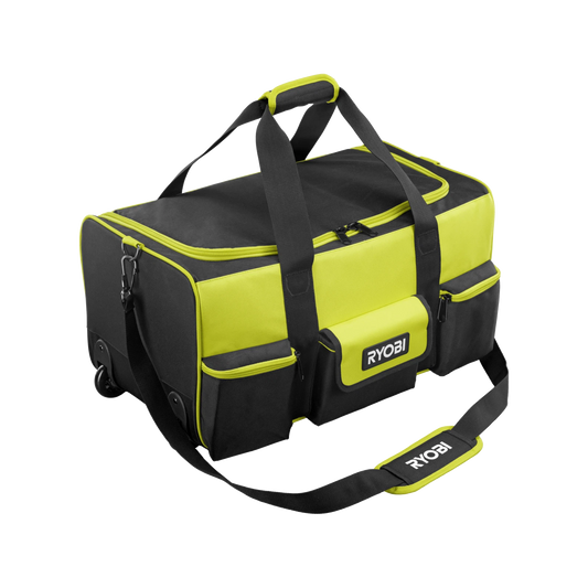Ryobi 550mm wheelie tool bag with telescopic handle, 17 pockets, durable fabric