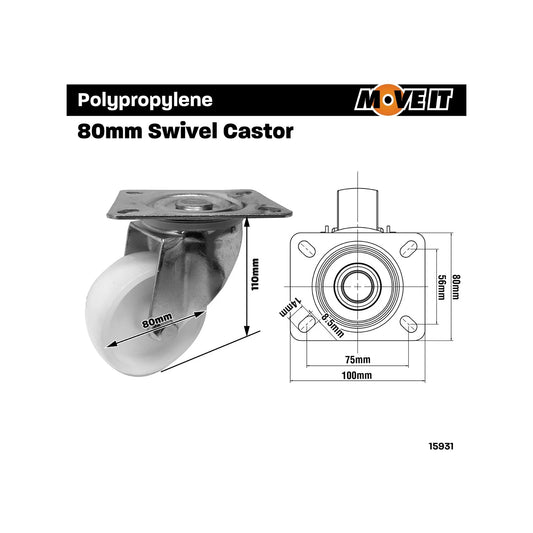 Move It 80mm White Polypropylene Swivel Castor 120kg Load Indoor Carpet Use
