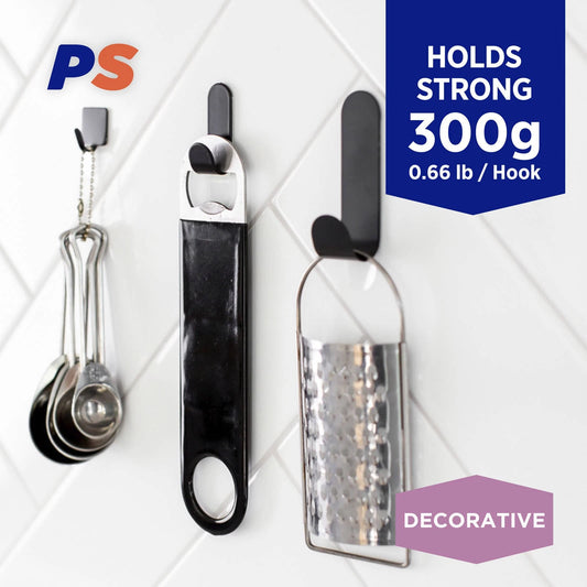 Permastik Small Black Metal Hooks 6 Pack - No Drilling, Stainless Steel, Matte Finish