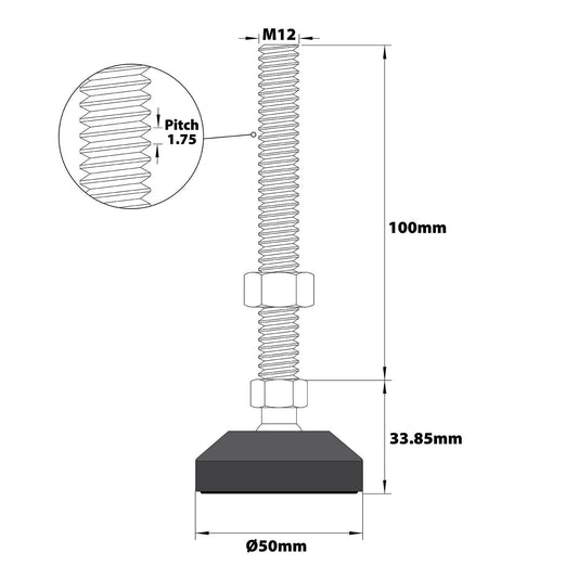 Easyroll 50mm Adjustable Foot with M12 x 100mm Bolt, Anti-Slip Rubber Base, 500kg Capacity
