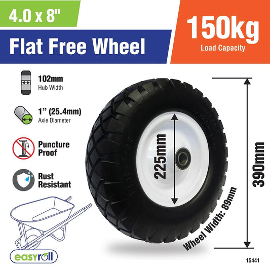 Easyroll 4.0 x 8" Flat Free Wheelbarrow Wheel, Puncture Proof, 100kg Load Capacity