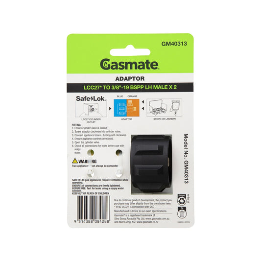Gasmate lcc27 to 3/8" bspp lh adaptor, dual appliance connection, brass & nylon