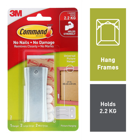 Command™ Large Metal Adhesive Picture Hanger, Damage-Free, Supports 2.2kg, Silver, 1 Pack