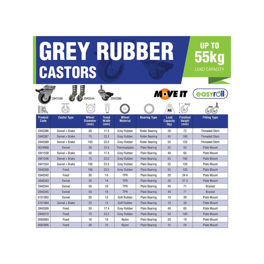 Move it 25mm rubber swivel castor with brake, 10kg load, shock absorbing, low height