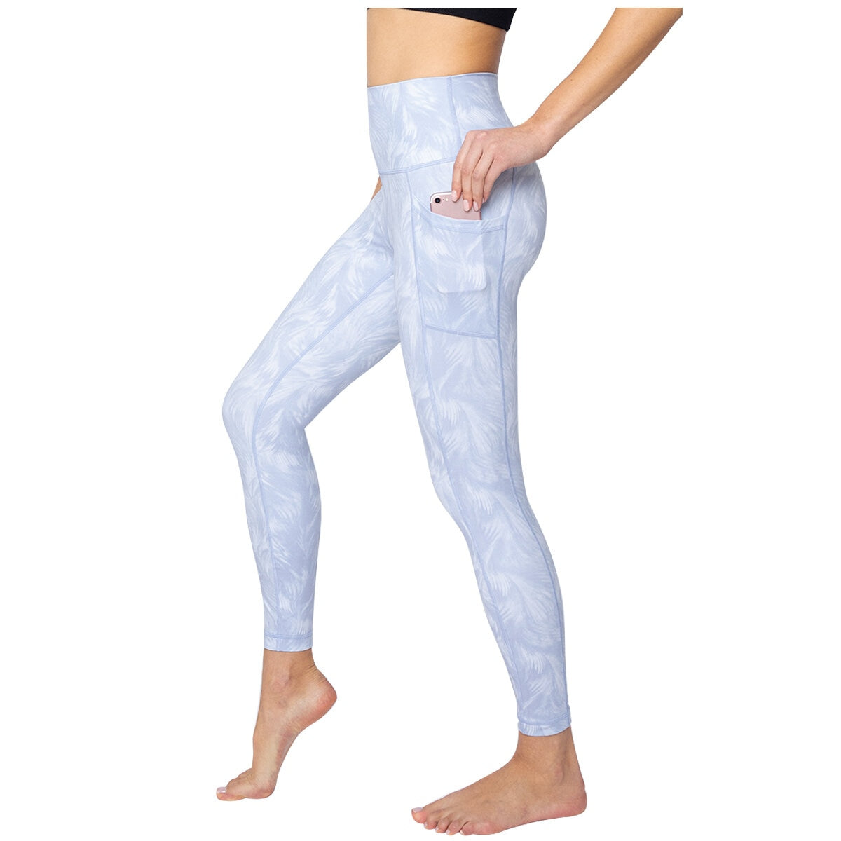 Step up your activewear game with these stylish and functional high-waisted ankle leggings. Featuring a chic feather-inspired palm tree print, they offer a flattering fit and practical side pockets for all your essentials. The ankle-length inseam provides smooth and comfortable wear, making them perfect for workouts, errands, or casual outings.