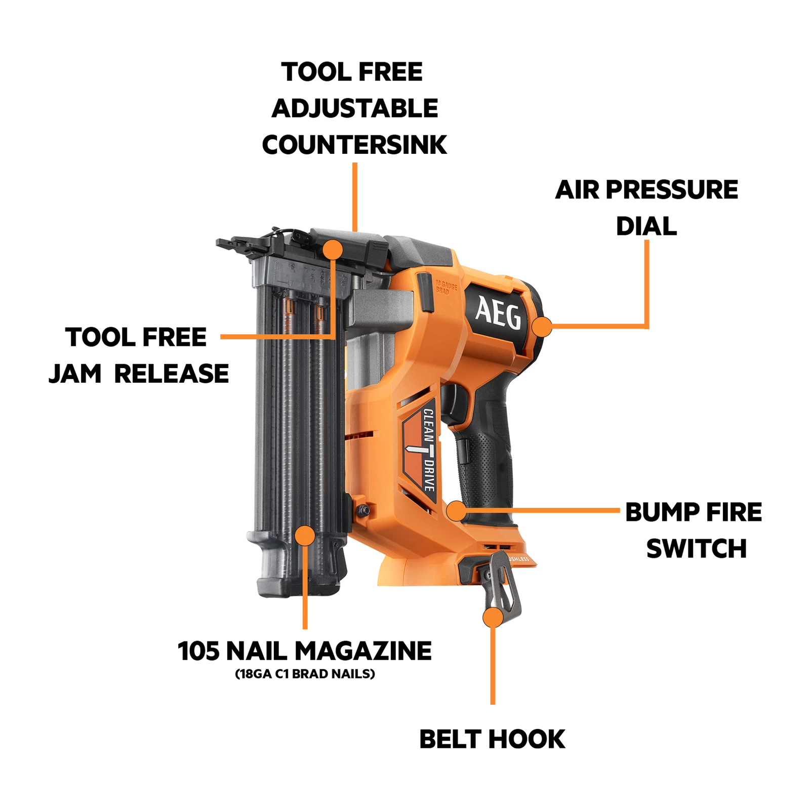 Upgrade your finishing toolkit with the AEG 18V 18GA Brushless Brad Nailer. Designed for professional results, this cordless nailer is perfect for fixing architraves, skirting, and other trim work. Powered by a robust brushless motor, it delivers reliable performance, longer runtime, and enhanced durability. Compatible with the entire AEG 18V battery range (battery and charger sold separately), this tool offers convenience and efficiency for your woodworking projects.