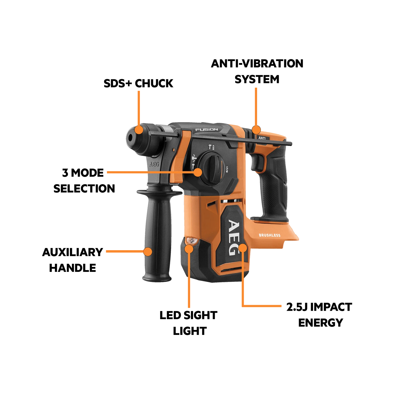 Upgrade your power tool collection with the AEG 18V 26mm FUSION SDS+ Rotary Hammer Drill. Designed for professional and DIY use, this versatile tool delivers powerful performance for drilling, hammer drilling, and chiseling into masonry. Its advanced features ensure efficiency, durability, and user comfort on every job site.