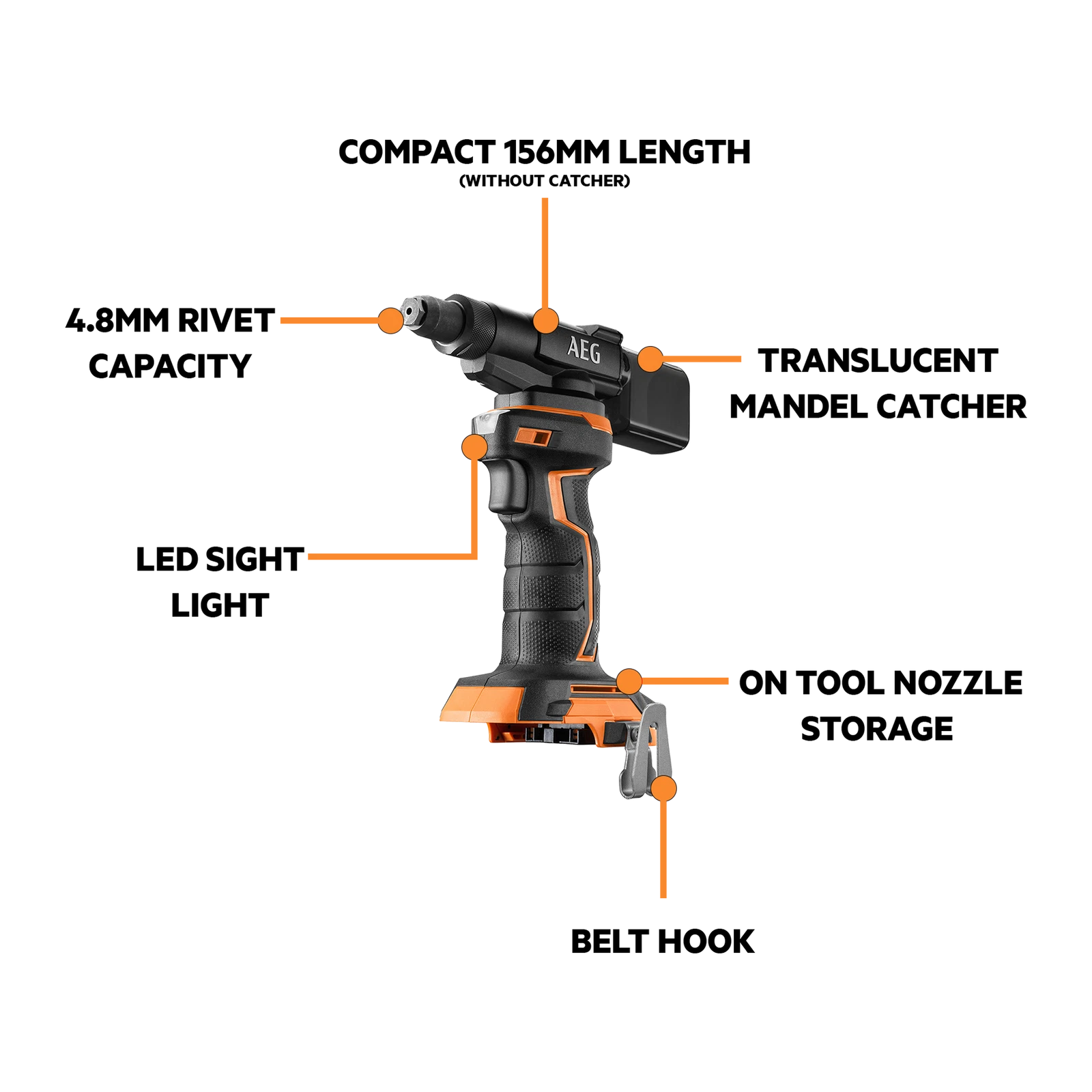 Upgrade your fastening toolkit with the AEG 18V 4.8mm Compact Rivet Gun. Designed for efficiency and ease of use, this powerful rivet gun is perfect for roofing, metal fabrication, automotive work, and more. Its compact size and advanced features make it a reliable choice for professionals and DIY enthusiasts alike.