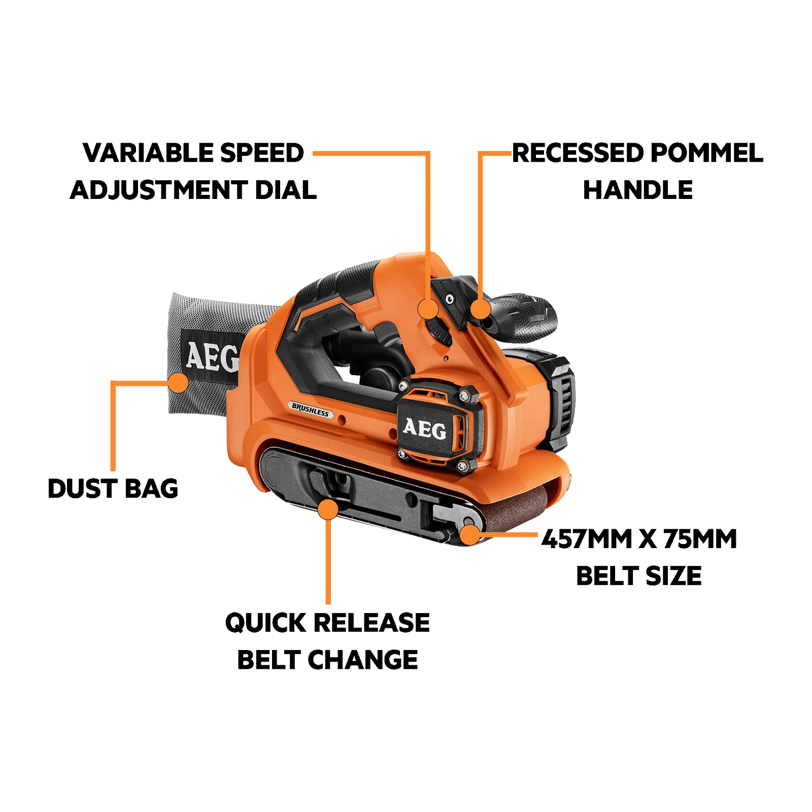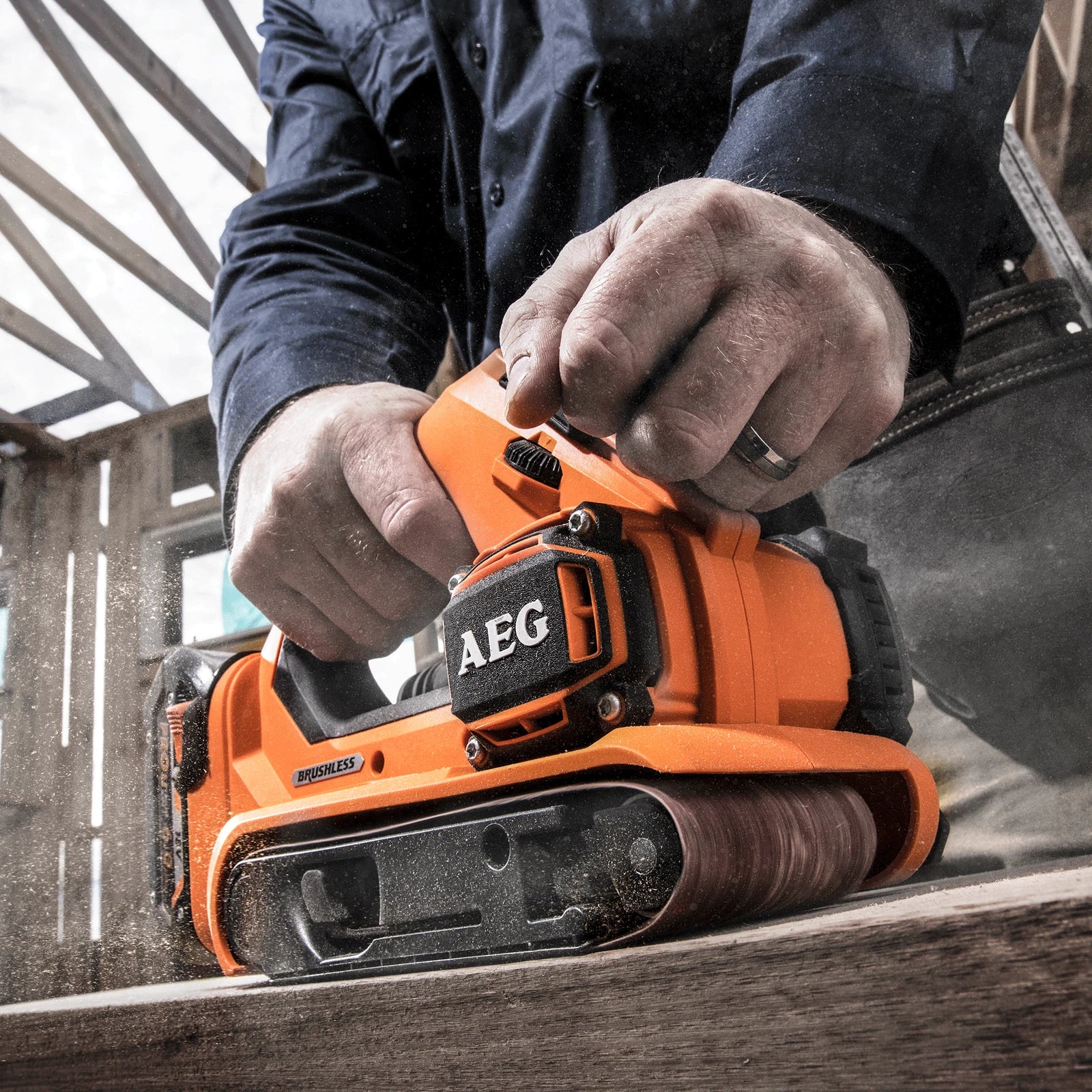 The AEG 18V Brushless Belt Sander offers a combination of power, versatility, and user comfort. Its quick belt change system and variable speed trigger make it suitable for a wide range of sanding tasks. Please remember, the battery and charger are sold separately. Trust AEG for reliable performance on your next project.