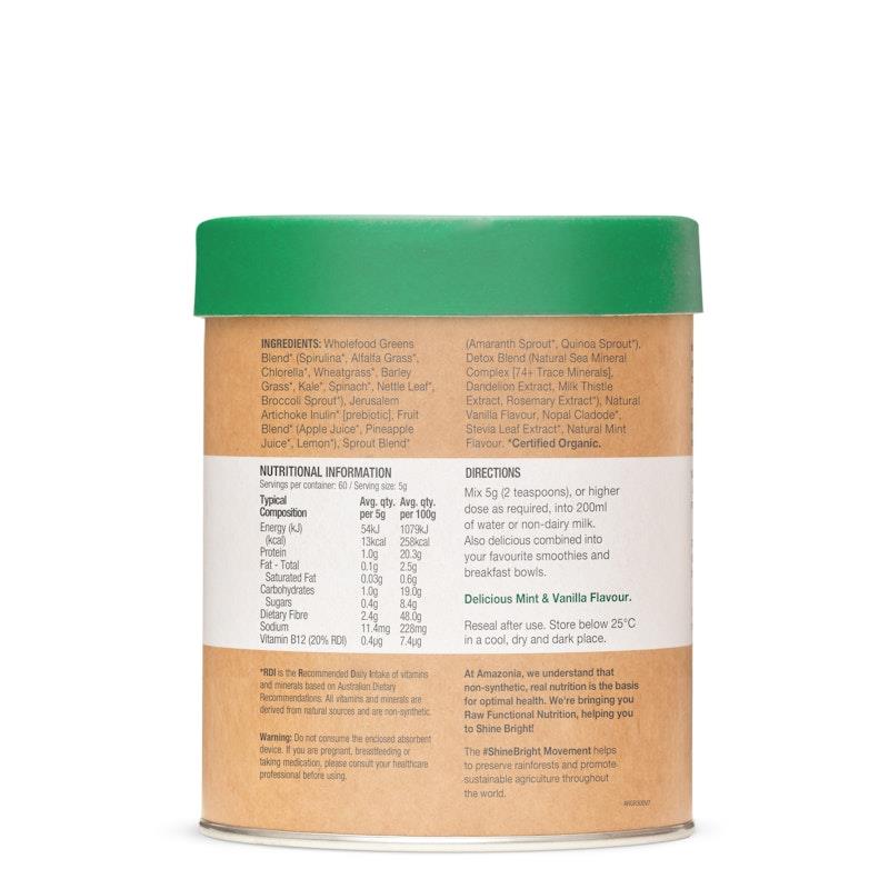 Wholefood Greens Blend* (Spirulina*, Alfalfa Grass*, Chlorella*, Wheatgrass*, Barley Grass*, Kale*, Spinach*, Nettle Leaf*, Broccoli Sprout*)Jerusalem Artichoke Inulin* [prebiotic]Fruit Blend* (Apple Juice, Pineapple Juice*, Lemon*)Sprout Blend* (Amaranth Sprout*, Quinoa Sprout*)Detox Blend (Natural Sea Mineral Complex [74+ Trace Minerals], Dandelion Extract, Milk Thistle Extract, Rosemary Extract)Natural Vanilla FlavourNopal Cladode*Stevia Leaf Extract*Natural Mint Flavor. *Certified Organic.