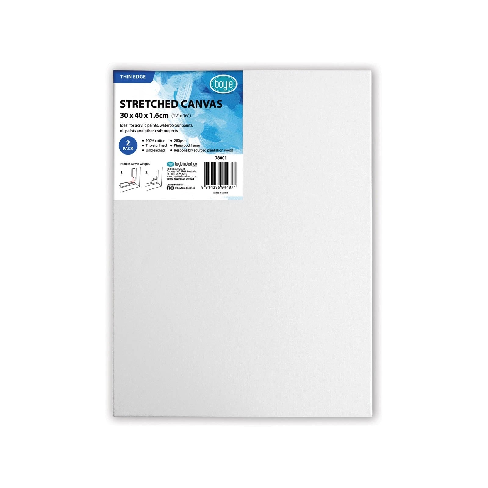 Perfect for acrylics, oils, watercolours, or other craft projects, this set provides a reliable surface for your creative pursuits. Experience quality craftsmanship with the Boyle 2-pack of 30 x 40cm thin edge canvases, designed to meet your artistic needs with ease and style.