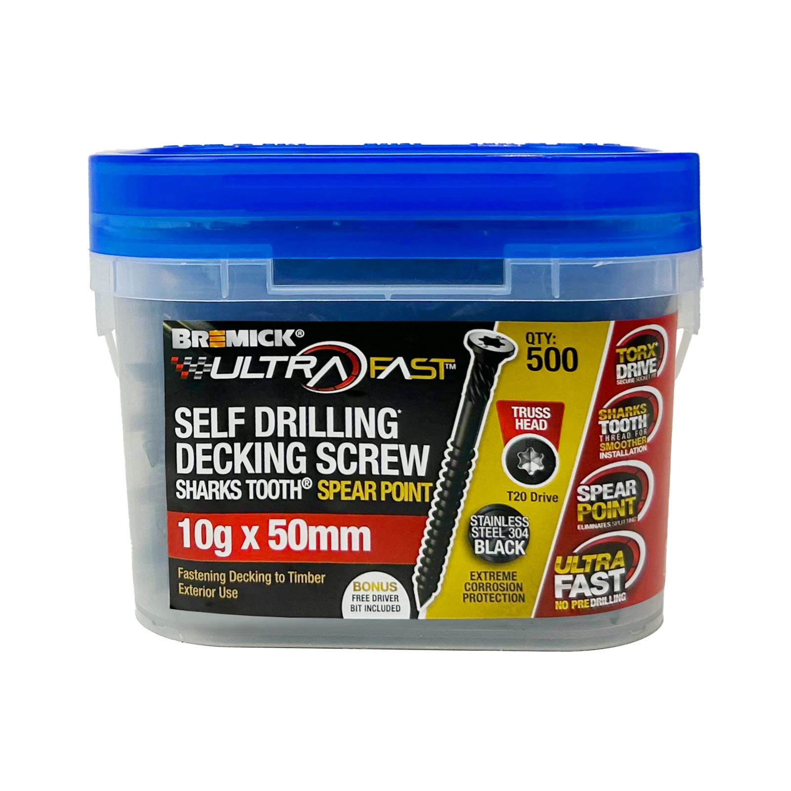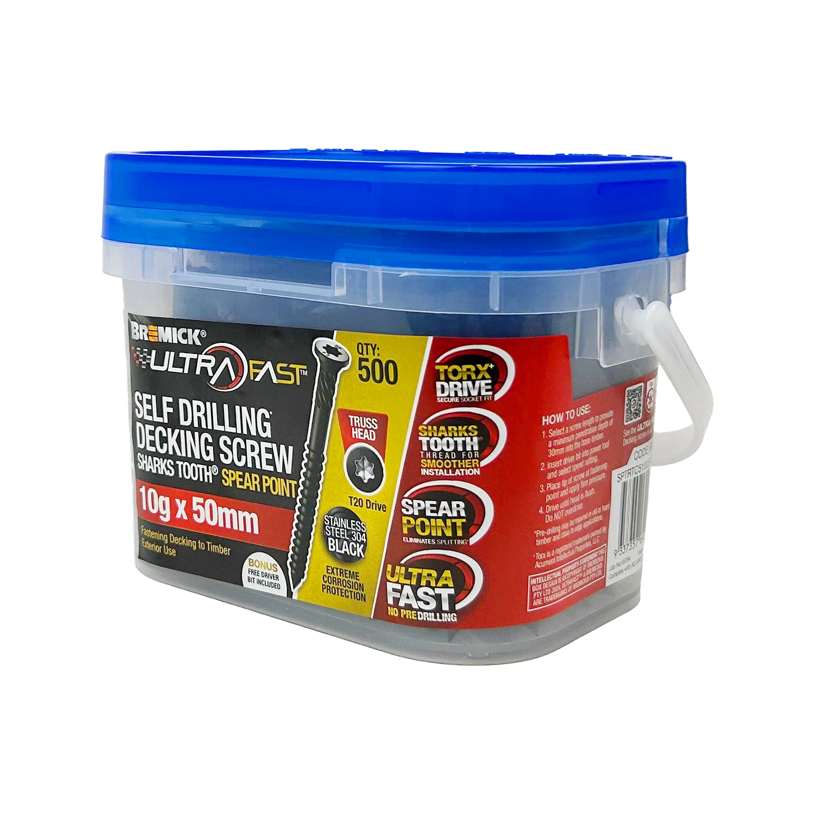 Includes 1 x Bremick Ultrafast 10g x 50mm Stainless Steel 304 Black T20 Truss Head Screws – 500 Pack.