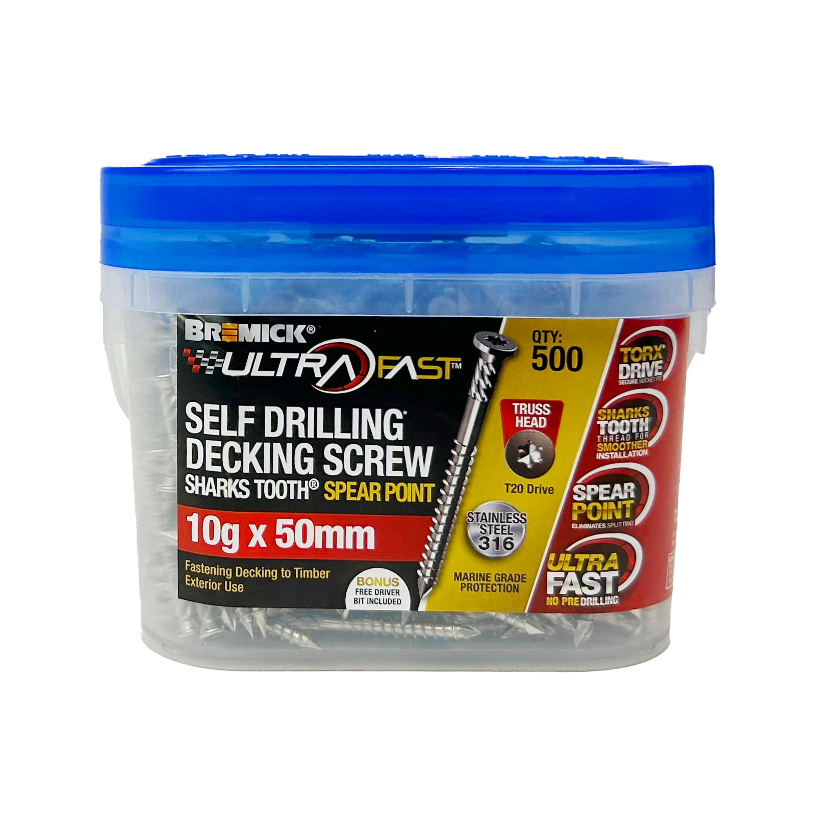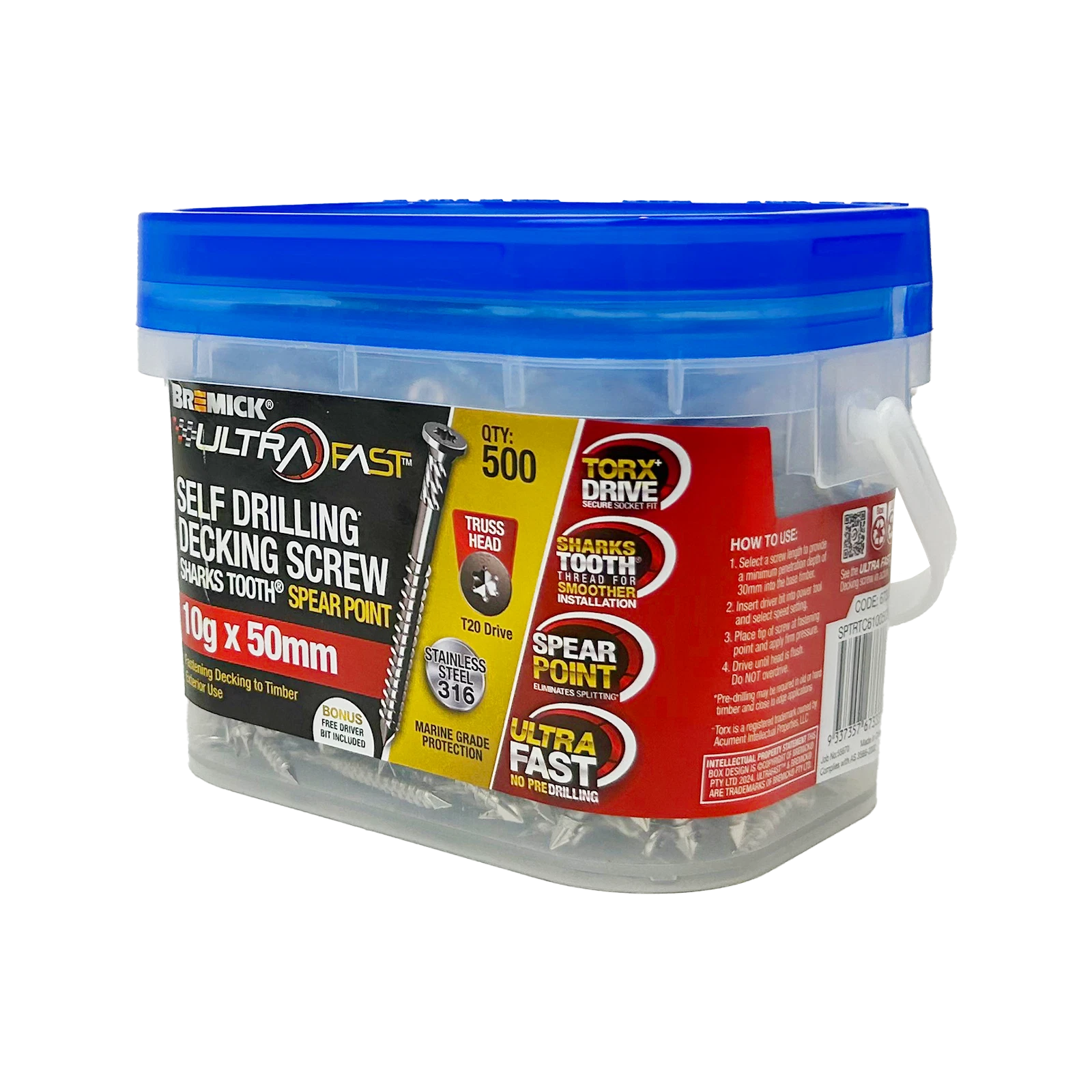 Includes 1 x Bremick Ultrafast 10g x 50mm Stainless Steel 316 T20 Truss Head Screws – 500 Pack.