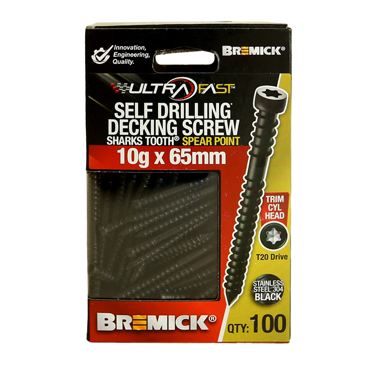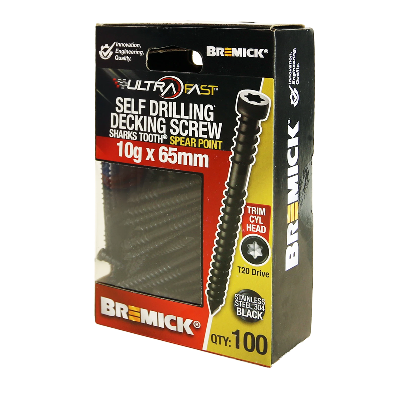 1 x Bremick Ultrafast 10g x 65mm Stainless Steel 304 Black T20 Trim Head Screws – 100 Pack
