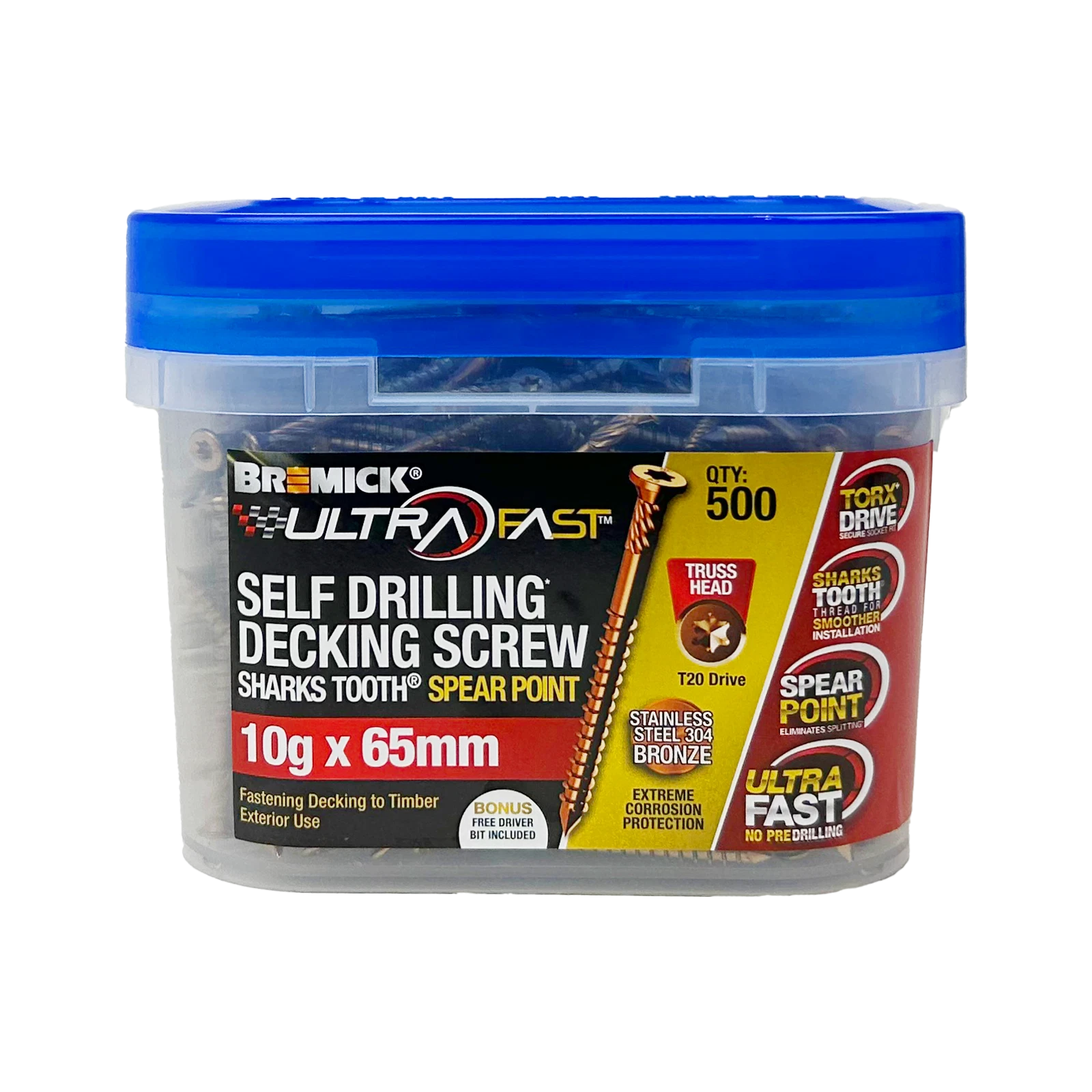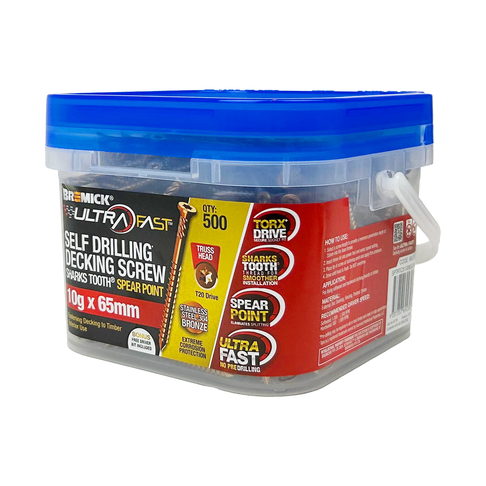 Upgrade your decking projects with the Bremick Ultrafast 10g x 65mm Stainless Steel 304 Bronze T20 Truss Head Screws. Designed for fast, secure, and professional results, these screws are ideal for softwood and hardwood decking applications. Experience effortless installation and a flawless finish with this high-quality, bulk pack of 500 screws.