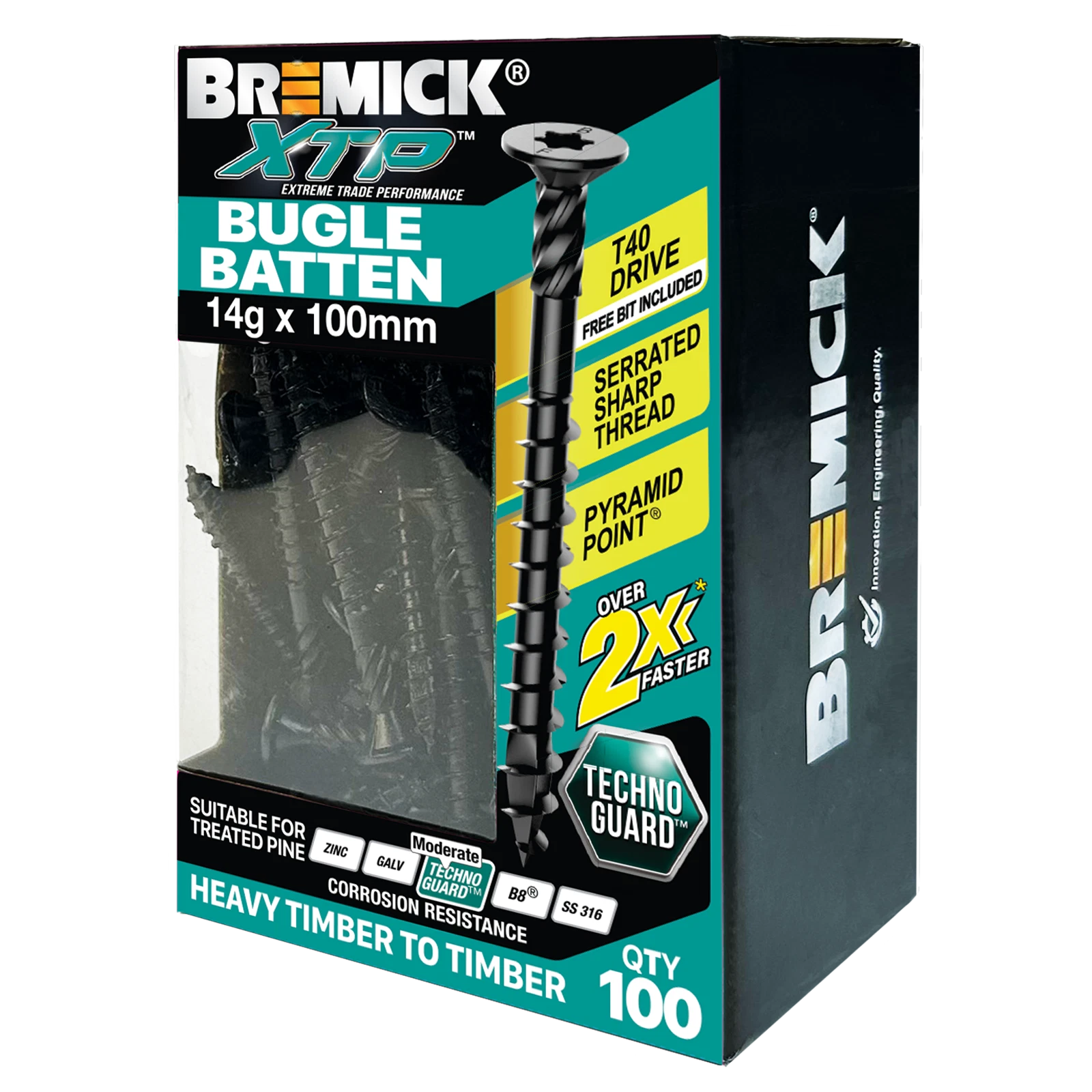 Includes 1 x Bremick XTP 14g x 100mm Black T40 Technoguard Bugle Batten in a convenient 100-pack.
