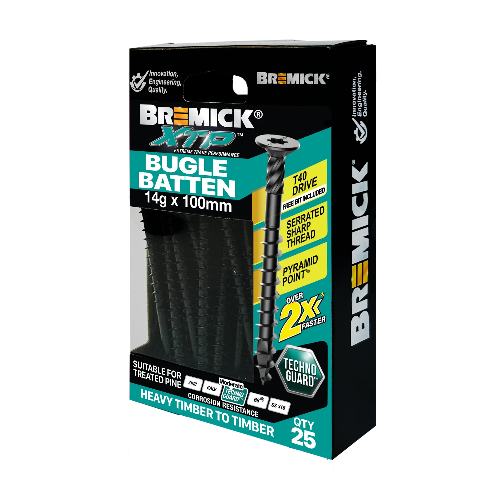 Includes 1 x Bremick XTP 14g x 100mm Black T40 Technoguard Bugle Batten – 25 Pack.