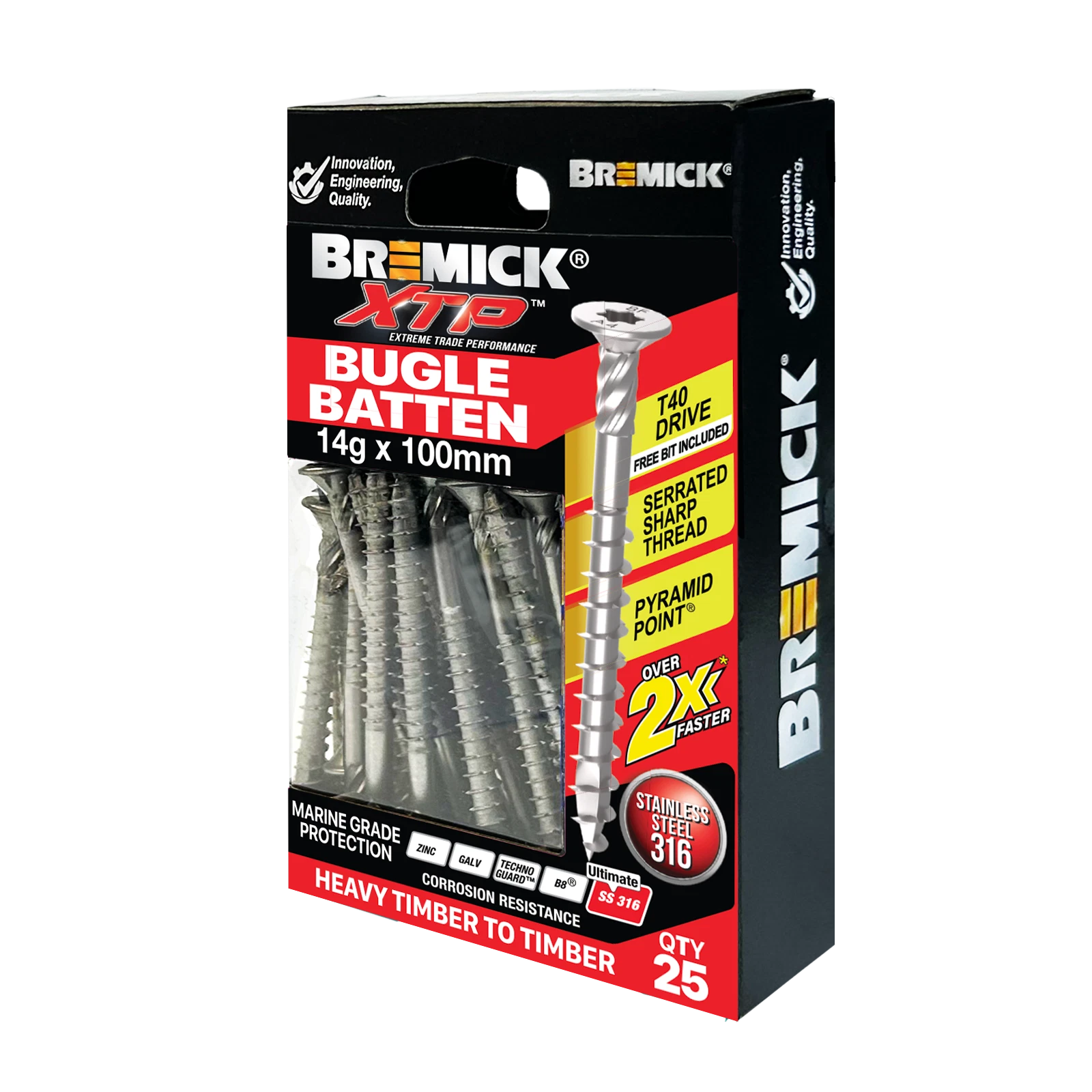 Includes 25 Bremick XTP 14g x 100mm T40 Stainless Steel 316 Bugle Batten Screws.