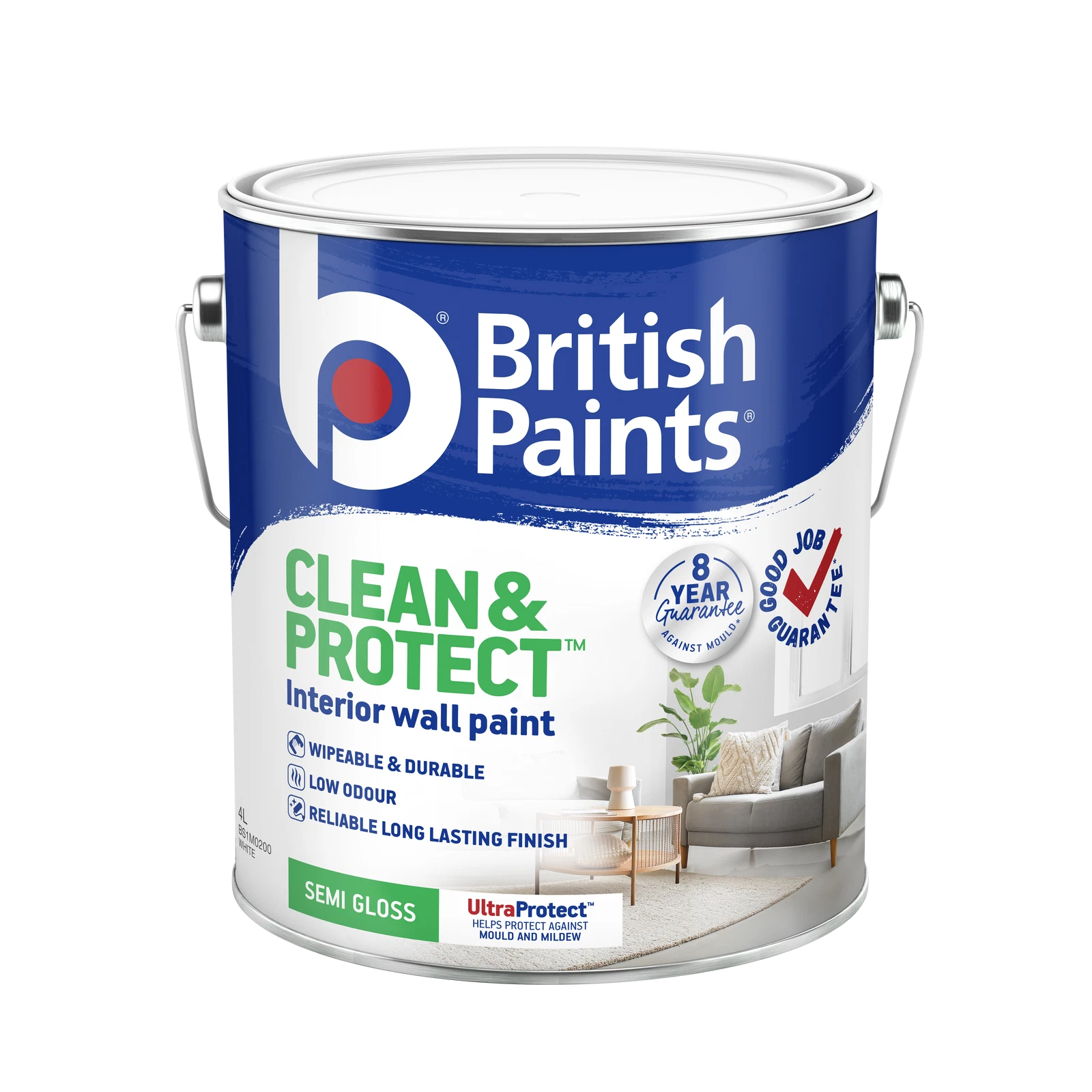 Includes 1 x British Paints 4L White Semi Gloss Clean & Protect Interior Paint.