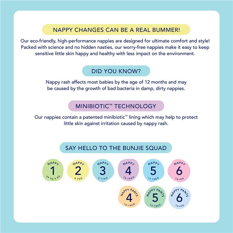 Our eco-friendly, high-performance nappies are crafted for ultimate comfort and style! Bunjie's scientifically formulated nappies are free from harmful chemicals, ensuring your baby's sensitive skin remains happy and healthy while reducing environmental impact.