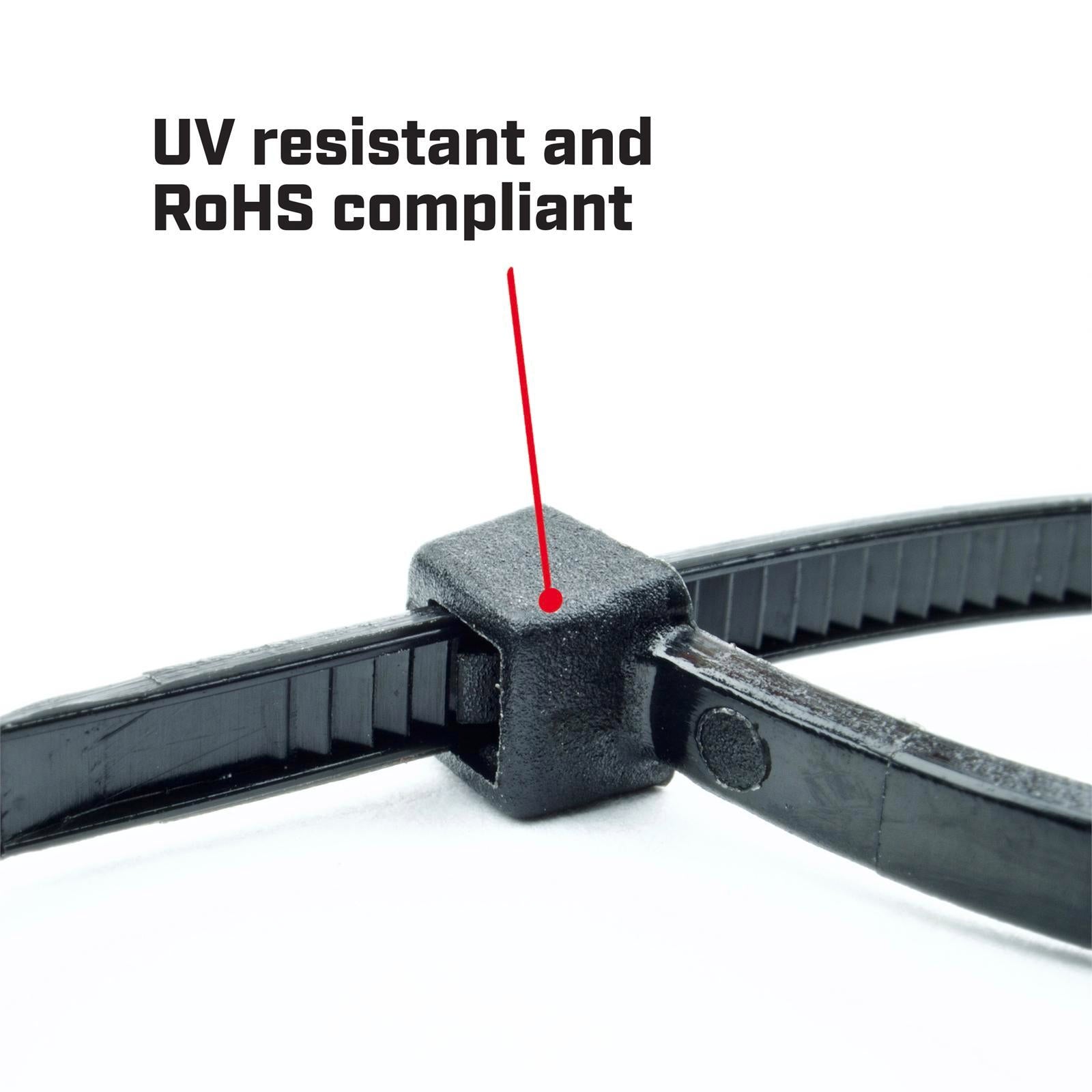 Crescent Cable Ties are high quality, self-locking nylon cable ties that come packaged in a handy, resealable zip lock bag, which enhances the life expectancy of the ties. The black cable ties are UV resistant, which prolongs useful life under sunshine/outdoor applications. Available in a range of sizes, these nylon UL approved cable ties are resistant to most chemical acids and are ideal for use in the home, office, or workshop.
