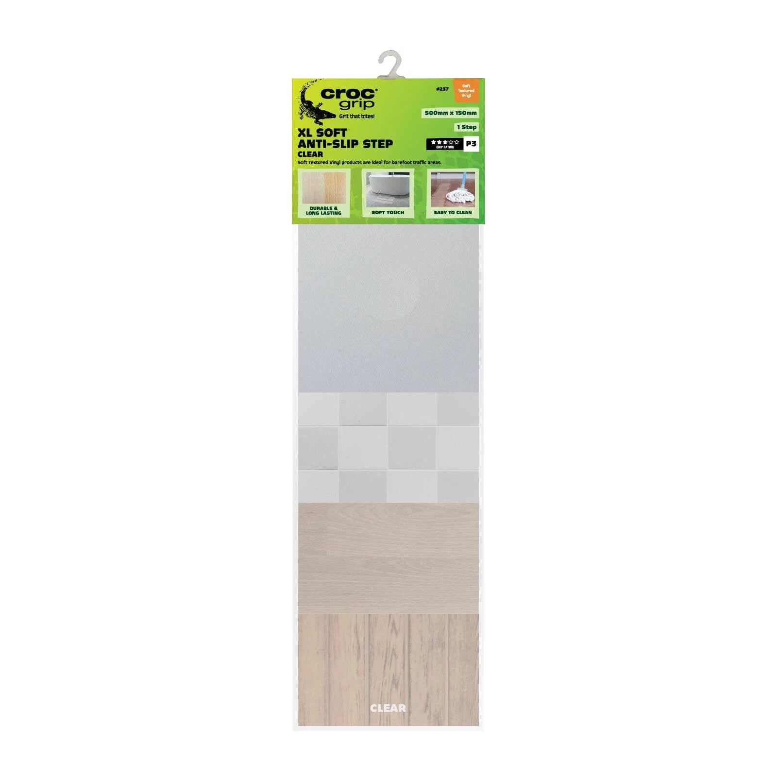 Enhance safety and comfort with the Croc Grip Clear XL Soft Textured Step. Designed for both indoor and outdoor use, this durable anti-slip solution provides a soft underfoot feel while reducing the risk of slips, trips, and falls in high traffic areas. Its water-resistant adhesive ensures reliable application and long-lasting performance.