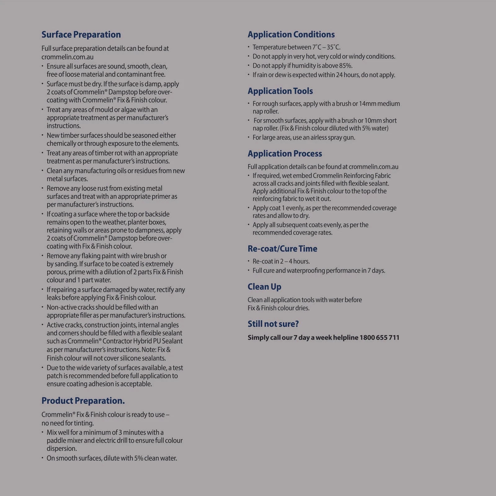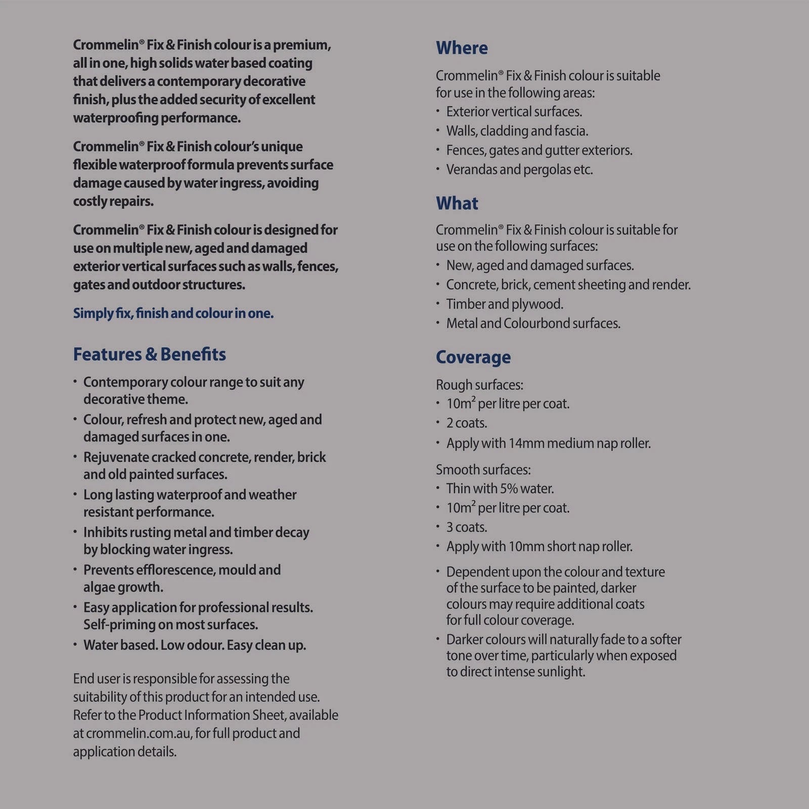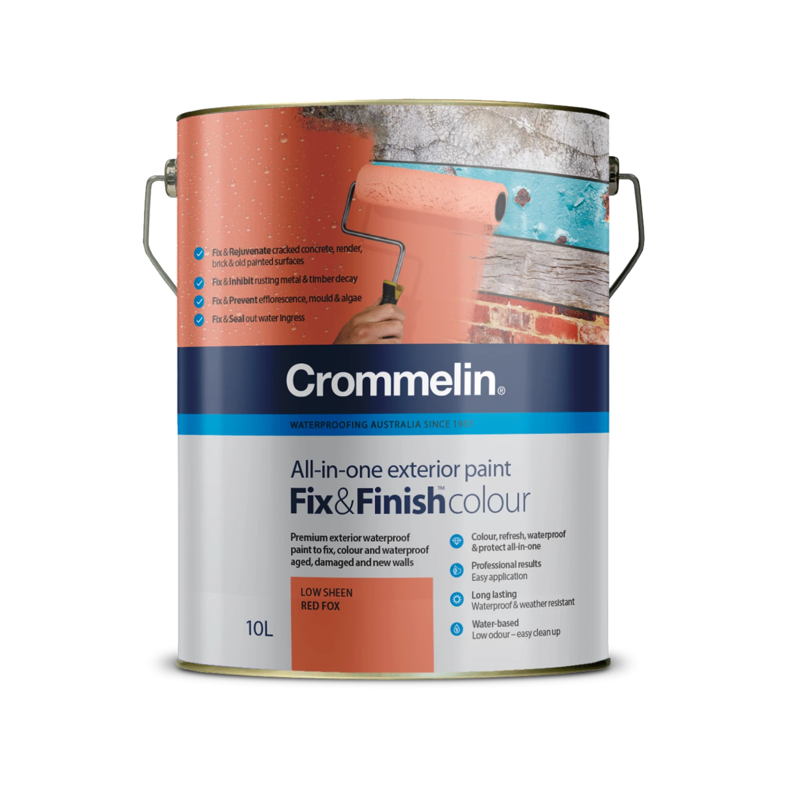 Enhance and protect your exterior surfaces with the Crommelin 10L Red Fox Fix and Finish Colour. This versatile, high-performance waterproof paint is designed to repair, colour, and safeguard aged, damaged, and new walls, fences, gates, and outdoor structures—all in one easy application.