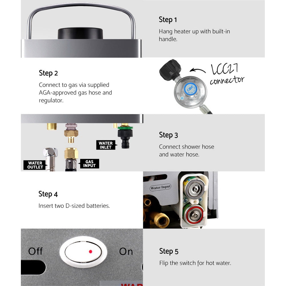 Who doesn't like a just-right warm water shower anywhere, anytime? The Devanti Gas Water Heater is all you need for that instant shower gratification.Designed for outdoor use and easy to install, the gas water heater can heat up to 480 L of water per hour, which is ample enough to have a shower, wash the dishes, or even clean the dog. The water temperature is easily adjustable and shown on the bright LED display. Better still, the in-built processor stops the water temperature from exceeding 50°C, thereby preventing accidental scalding. Not least, the variable flow showerhead has an automatic on/off trigger that ignites and switches off the burner.Your purchase also comes with a 12V pressure pump to help in removing or collecting water in remote locations or while camping with no access to a water outlet. The lightweight gas heater has many other great safety features, a convenient carry handle, and mounting brackets for a hassle-free setup anywhere. Order your Devanti Gas Water Heater today and enjoy wondrous showers in the open all the time.Note: Only for outdoor use. LPG portable gas bottle required for use.
