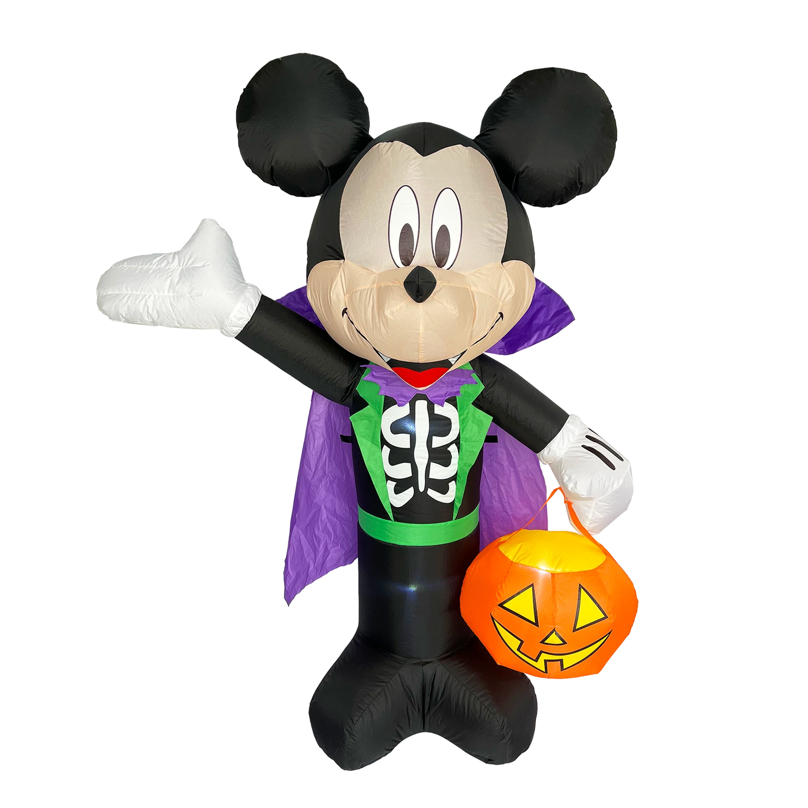 This inflatable features a vampire-inspired Mickey Mouse holding a jack-o-lantern pumpkin, perfect for Halloween festivities. When plugged in, it quickly inflates and stays securely in place with included rope tethers, plastic stakes, and internal weights. The internal LED lights enhance visibility and create a captivating glow that will attract attention from visitors and trick-or-treaters.