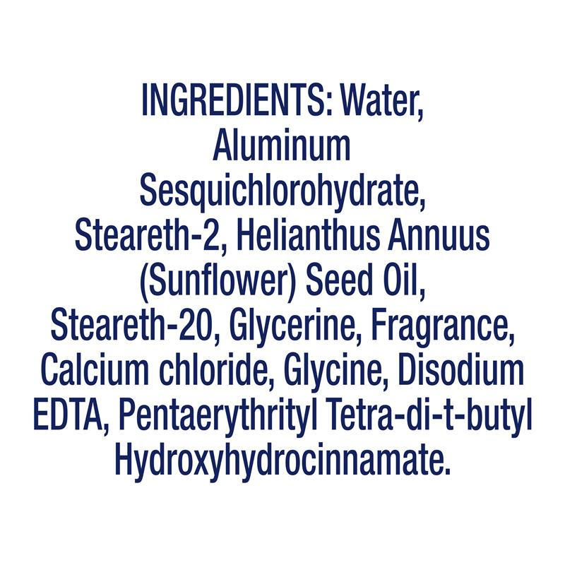 Water, Aluminum Sesquichlorohydrate, Steareth-2, Helianthus Annuus (Sunflower) Seed Oil, Steareth-20, Glycerine, Fragrance, Calcium chloride, Glycine, Disodium EDTA, Pentaerythrityl Tetra-di-t-butyl Hydroxyhydrocinnamate.