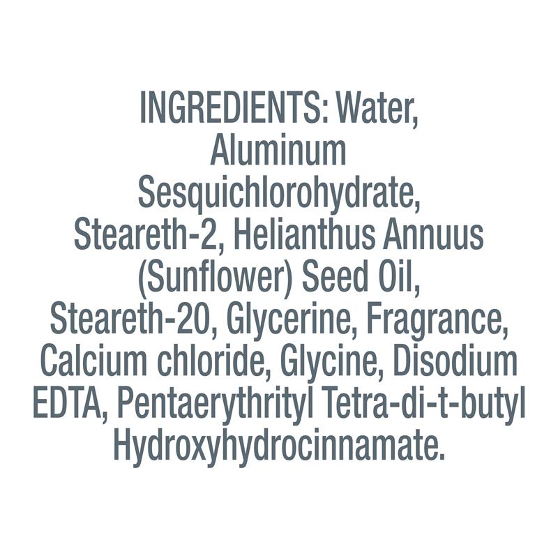 Water, Aluminum Sesquichlorohydrate, Steareth-2, Helianthus Annuus (Sunflower) Seed Oil, Steareth-20, Glycerine, Fragrance, Calcium chloride, Glycine, Disodium EDTA, Pentaerythrityl Tetra-di-t-butyl Hydroxyhydrocinnamate.