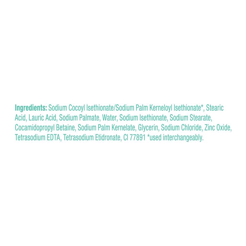 Sodium Cocoyl Isethionate/Sodium Palm Kerneloyl Isethionate*, Stearic Acid, Lauric Acid, Sodium Palmate, Water, Sodium Isethionate, Sodium Stearate, Cocamidopropyl Betaine, Sodium Palm Kernelate, Glycerin, Sodium Chloride, Zinc Oxide, Tetrasodium EDTA, Tetrasodium Etidronate, CI 77891 *used interchangeably.