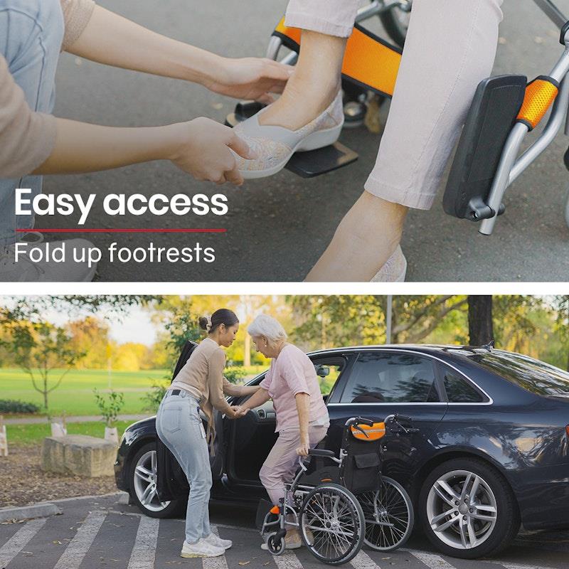 Experience freedom and confidence with the Equipmed Smartline 20 Inch Folding Wheelchair in striking orange. This premium wheelchair combines style, comfort, and practicality for a superior mobility experience.
