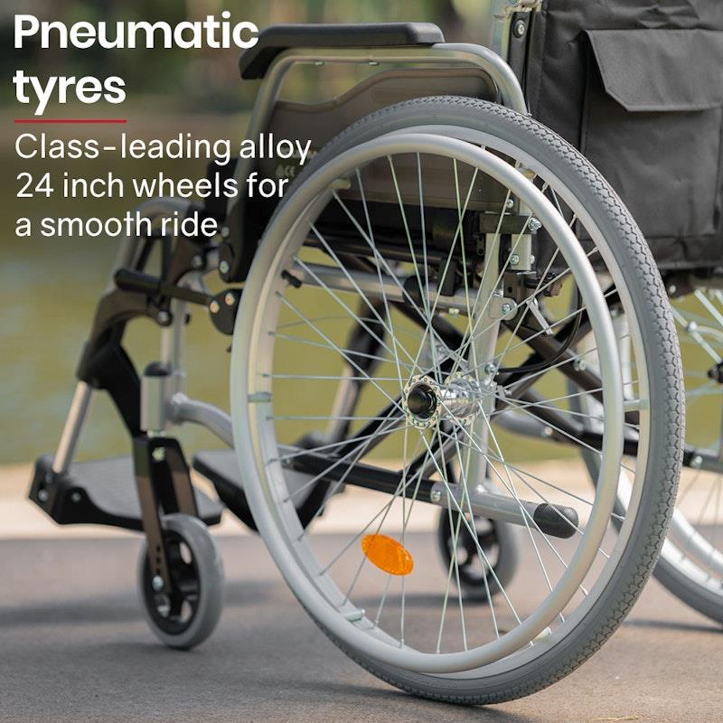 The Equipmed 24 Inch Folding Wheelchair is designed for ultimate comfort and ease of use. With padded flip-up armrests, detachable swing-away footrests, and dual park brakes, this wheelchair ensures a smooth ride for users and caregivers alike. Its foldable design makes it perfect for transport and storage.