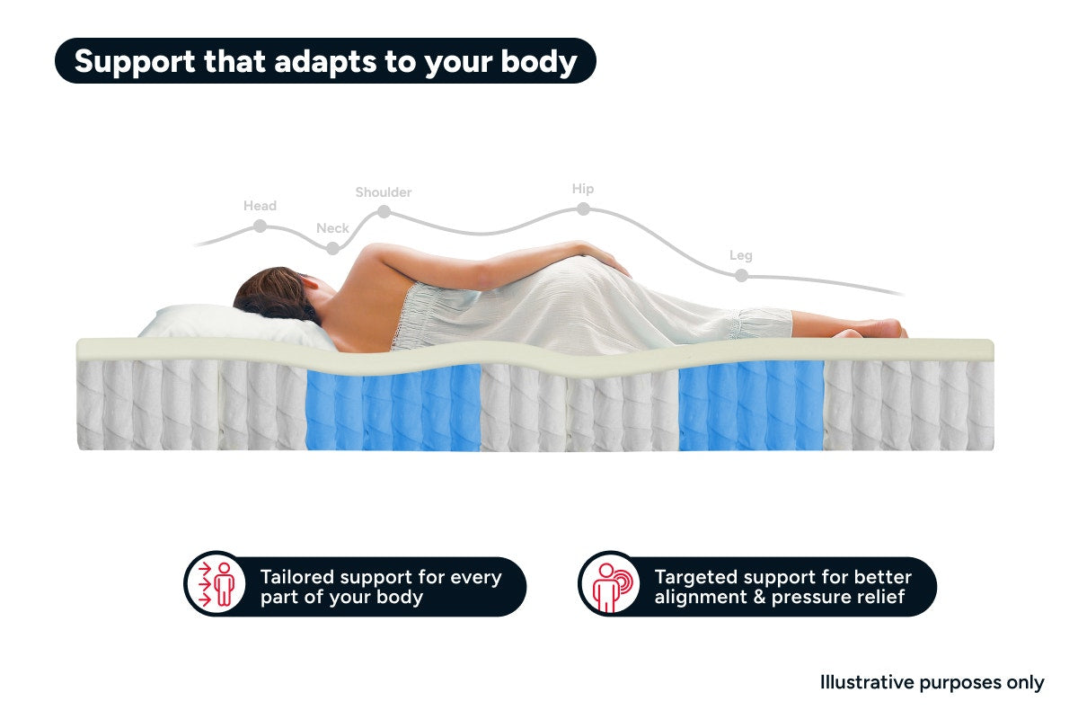 Designed with a Euro top layer, this mattress delivers an indulgently plush feel for unmatched comfort and support. Beneath it, 5-zone pocket springs provide targeted support to key pressure points, ensuring proper alignment for your head, shoulders, lower back, hips and legs. Perfect for sleepers who need extra support without sacrificing softness.
