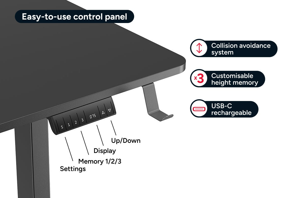With three programmable height settings, you can save your preferred desk positions for different activities or users. Ideal for maintaining consistent ergonomic alignment, these presets also help avoid obstacles like drawers or cabinets with reliable, repeatable accuracy.