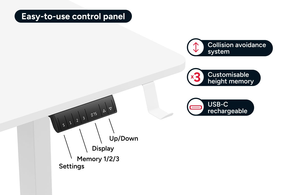 With three programmable height settings, you can save your preferred desk positions for different activities or users. Ideal for maintaining consistent ergonomic alignment, these presets also help avoid obstacles like drawers or cabinets with reliable, repeatable accuracy.
