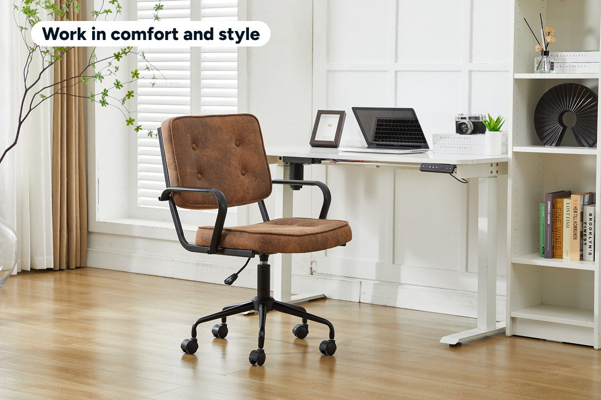 Designed with a distinctive button-tufted pattern, vintage brown finish, and gently curved edges, this chair offers an authentic retro vibe that complements any home office or shared workspace.