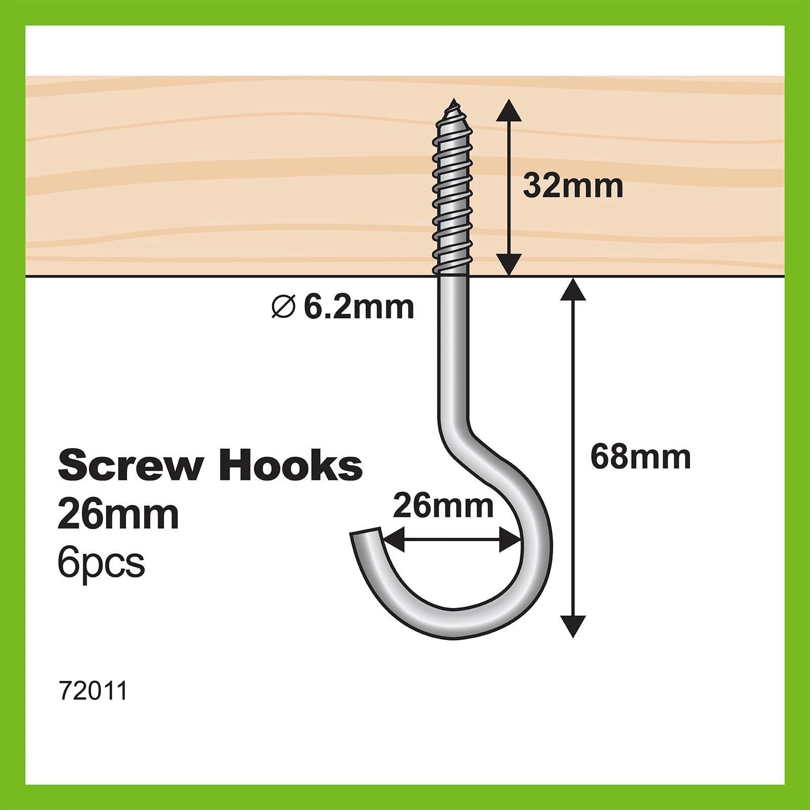Includes 6 x Everhang 26 x 6.2mm Zinc Plated Round Screw Hooks.