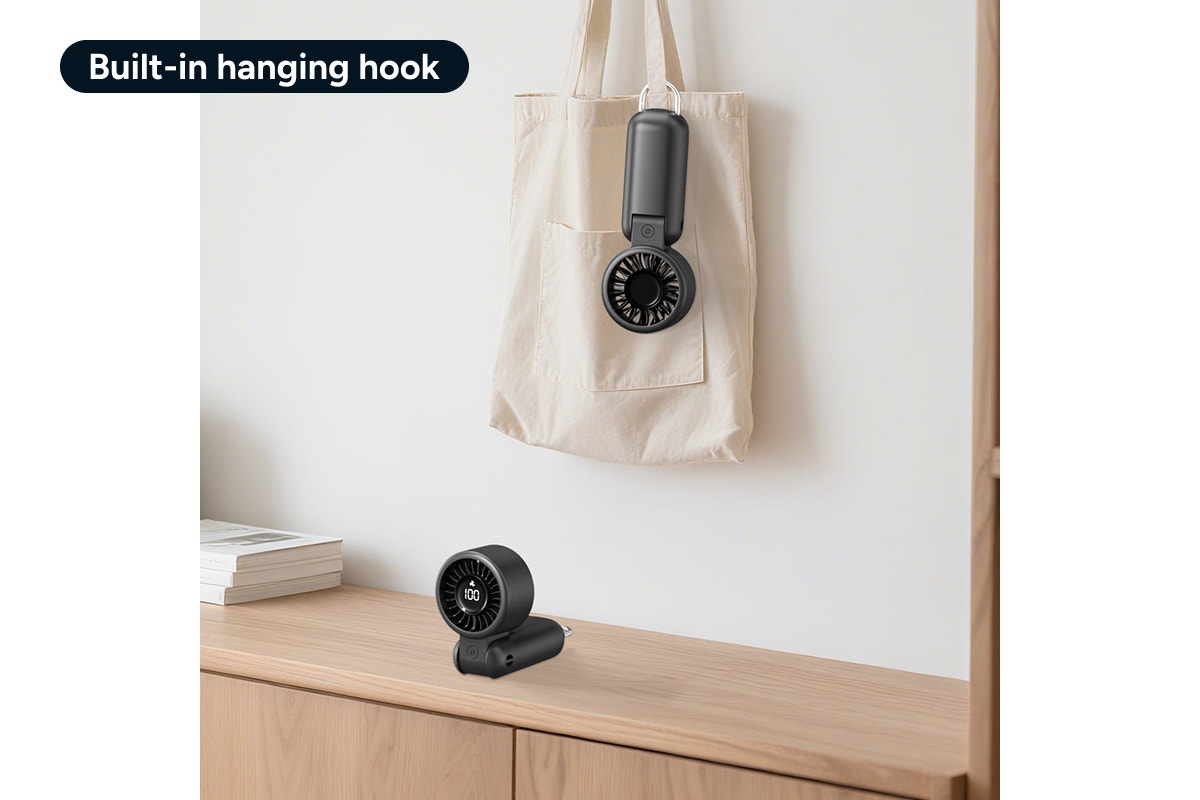 Powered by a 2000mAh battery, this fan gives you up to 5 hours of use on a single charge. With a built-in hook and an included neck strap, it adapts to your situation and is perfect for travel, camping, festivals or everyday use on the go.