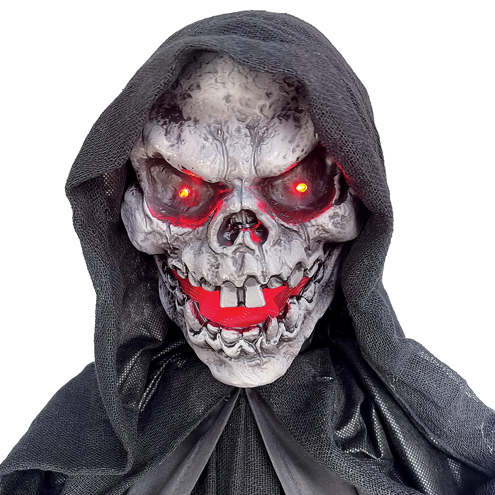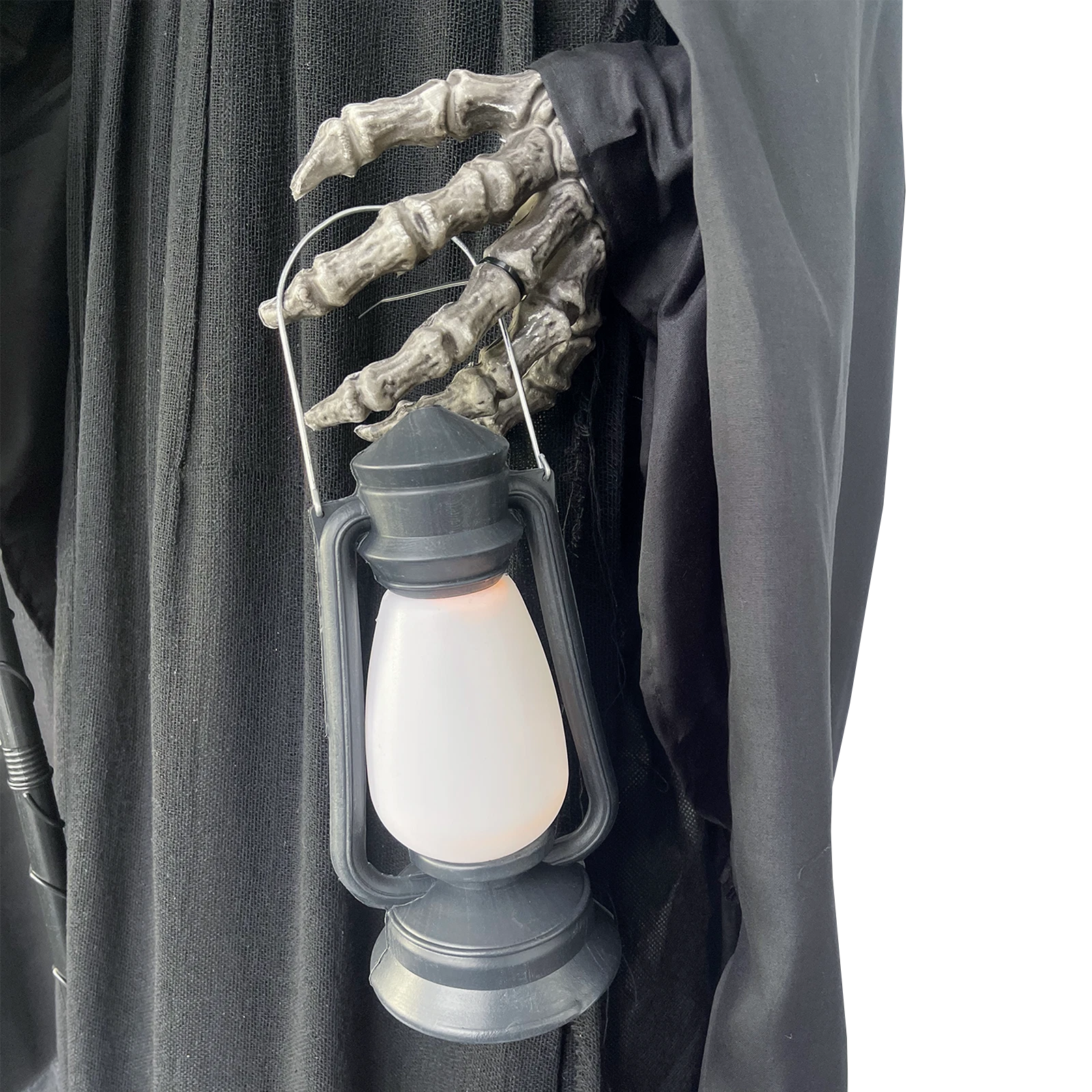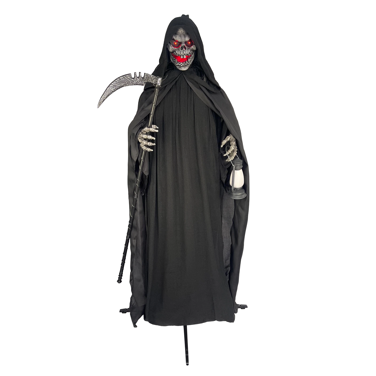 This life-sized Reaper stands at 1.8 meters tall, designed to spook and entertain during Halloween festivities. When activated by sound, it moves its head, jaw, and torso, lights up its eyes, mouth, and lantern, and emits a frightening loud voice. The included batteries ensure immediate operation, and the product is simple to assemble for quick setup.