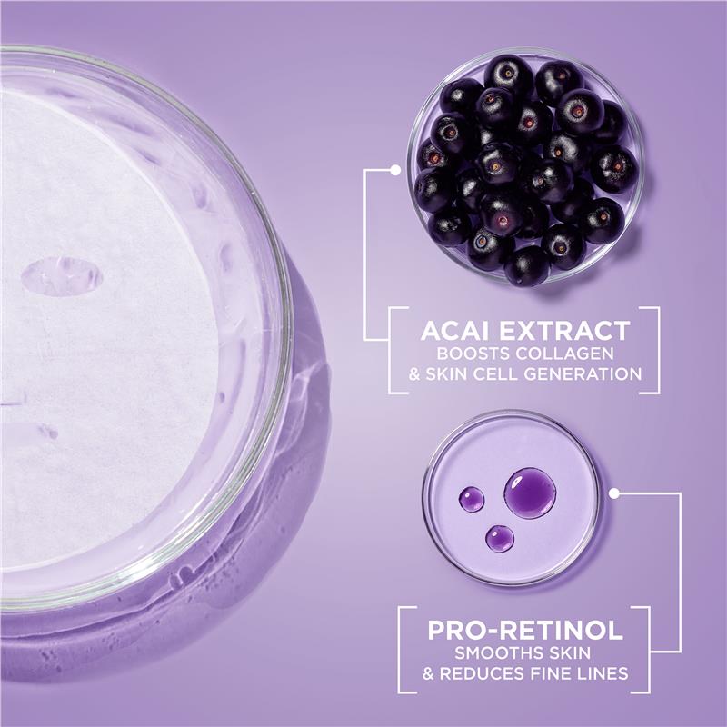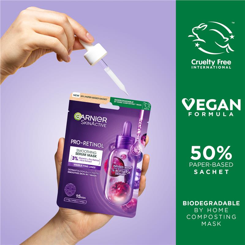 Experience smoother, younger-looking skin in just 15 minutes with the Garnier Pro-Retinol Serum Mask. Infused with the equivalent of half a bottle of serum, this vegan formula is supercharged with 3% Pro-Retinol, Acai Extract, and Glycerin to combat signs of aging.