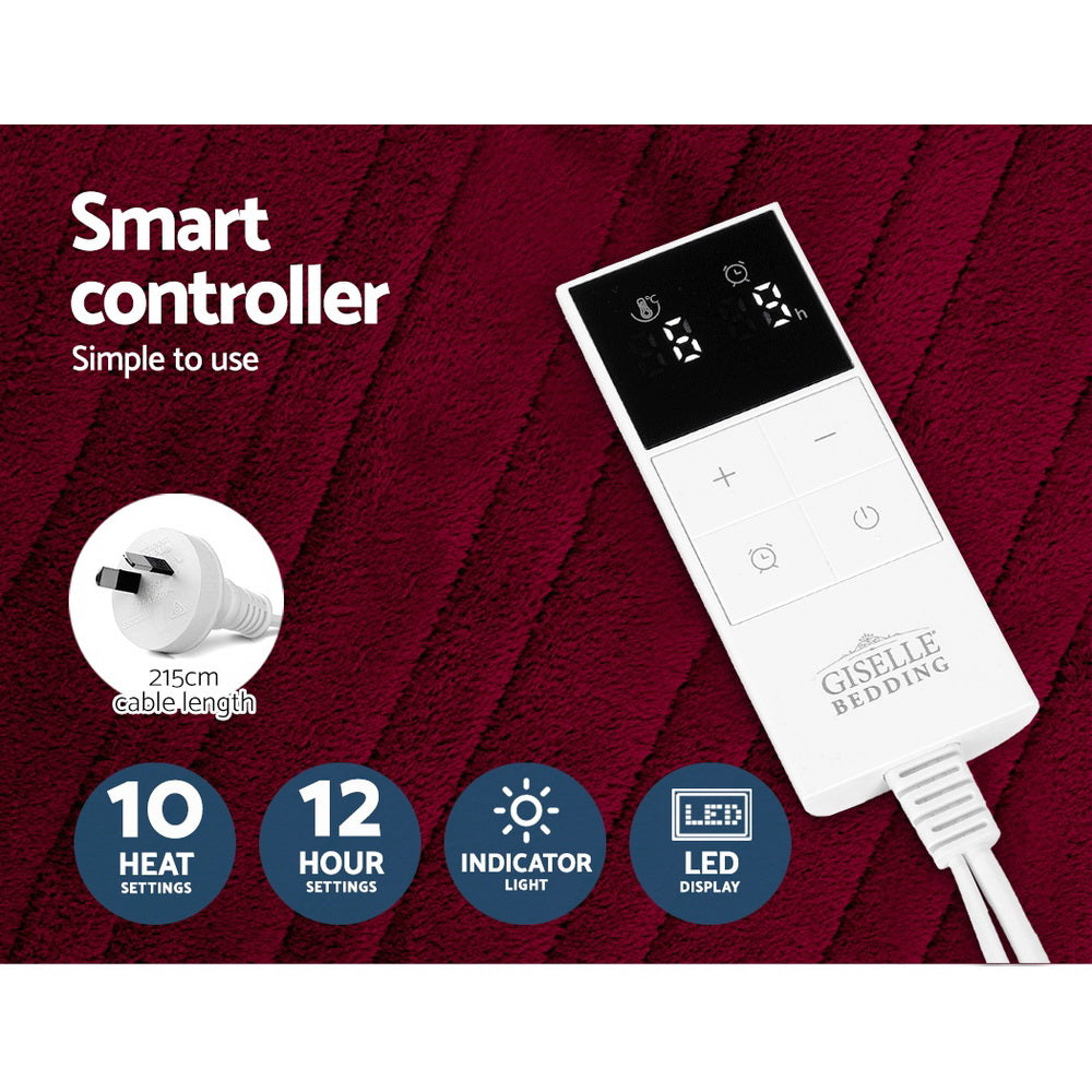 Specifications:Brand: Giselle BeddingDimensions: 160cm x 130cmMaterial: Coral fleecePower: 80WVoltage: 220V-240V, 50HzTimer: 1 to 12 hoursHeat setting: 10 levelsMaximum temperature: 45°C-55°CCable length: 215cmPlug: SAA-approvedColour: BurgundyAssembly required: NoNumber of packages: 1