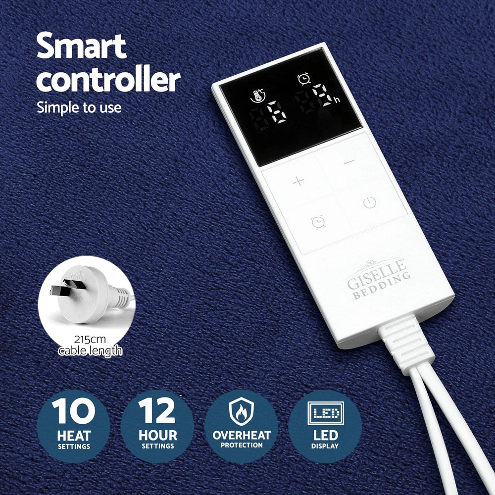 Specifications:Brand: Giselle BeddingDimensions: 160cm x 130cmMaterial: Flannel and sherpa fabricPower: 80WVoltage: 220V-240V, 50HzTimer: 1 to 12 hoursHeat setting: 10 levelsMaximum temperature: 45° - 55°Cable length: 215cmPlug: SAA-approvedColour: Navy BlueAssembly required: NoNumber of packages: 1