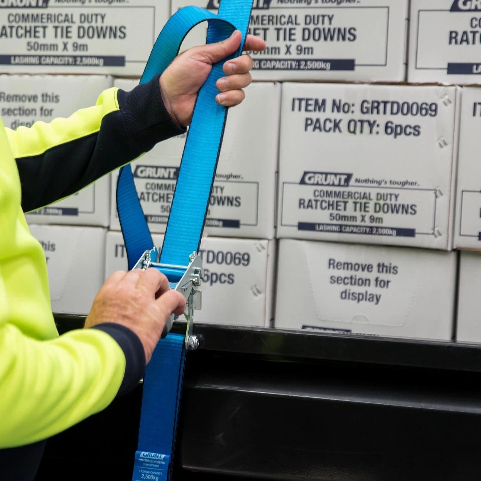 Secure your loads confidently with the Grunt 50mm x 9m Ratchet Tie Down, designed for commercial, trucking, and courier applications. Made from durable polyester webbing, this tie down offers a reliable and safe solution for securing cargo efficiently.