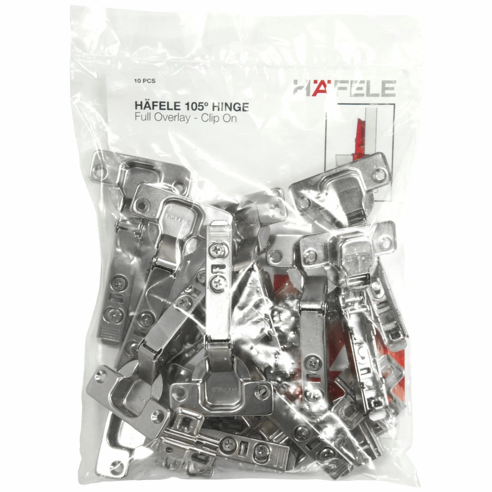 Includes 10 Hafele 105° Full Overlay Clip-On Hinges, ready for your cabinetry installation.