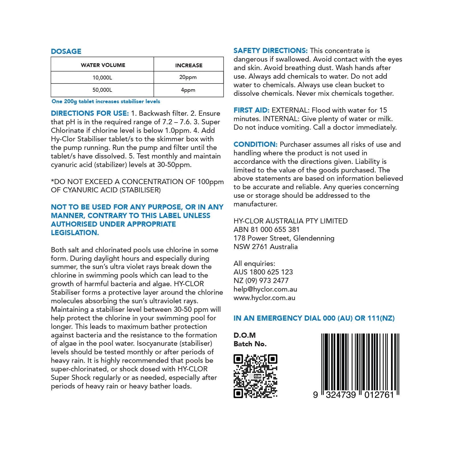 Enhance your outdoor pool experience with Hy-Clor 200G Stabiliser Tablets. Designed to prolong the effectiveness of your chlorine, these easy-to-use tablets help protect your pool from the sun’s UV rays while reducing chlorine consumption. Keep your pool clean, clear, and well-maintained with this reliable stabiliser solution.